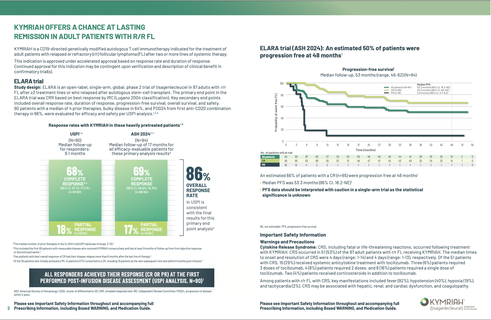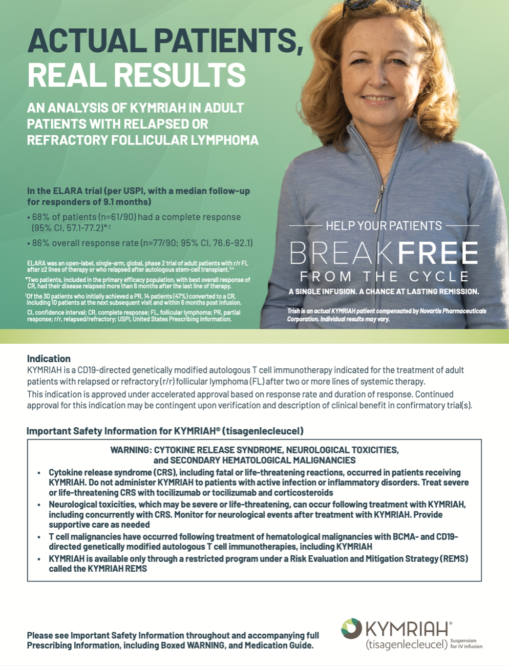 This asset synthesizes data from KYMRIAH clinical and real-world trials. The ELARA trial—the pivotal trial in r/r FL—provided controlled clinical data, while the Center for International Blood and Marrow Transplant Research Cellular Therapy Registry (CIBMTR-CTR) provided real-world insights.